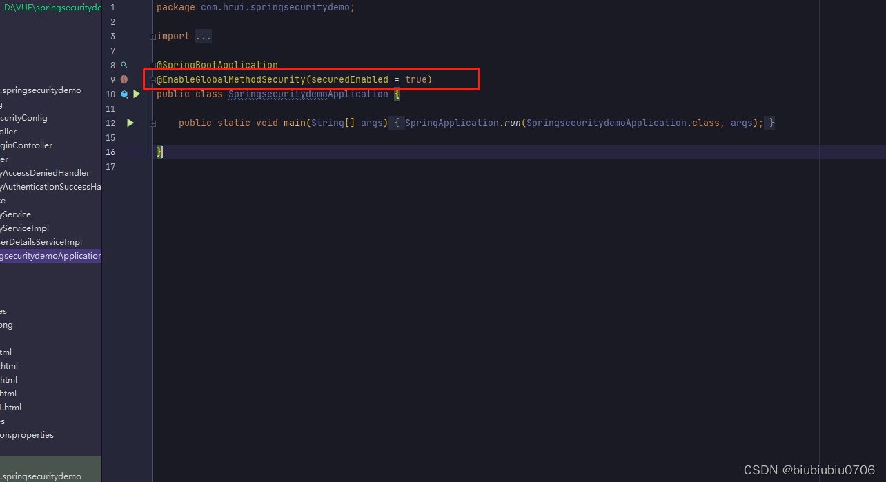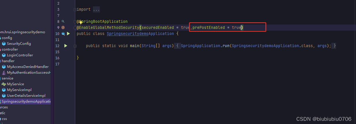 通过在启动类或者配置类添加@EnableGlobalMethodSecurity 开启Spring Security注解方式控制