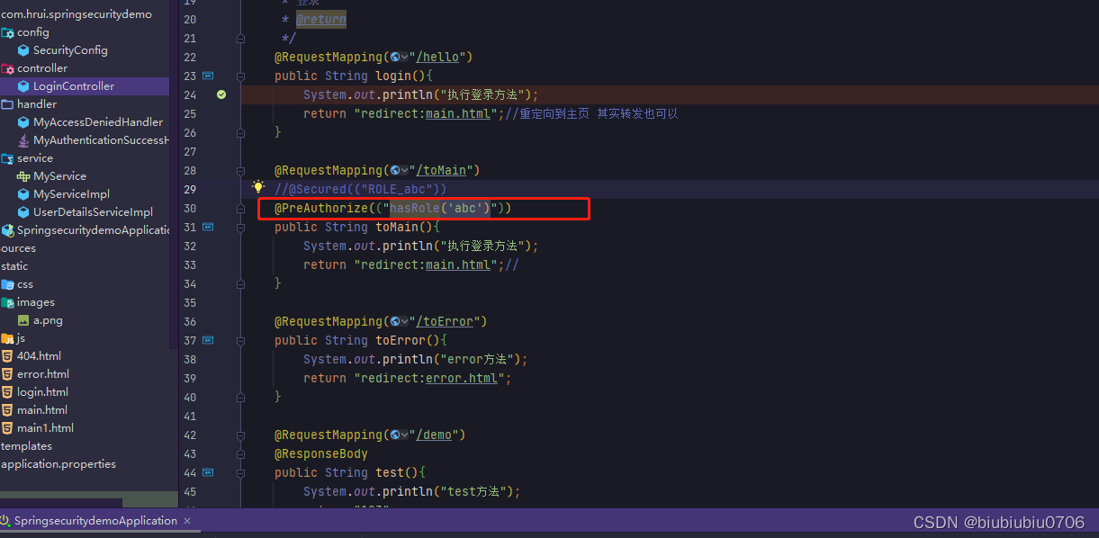 @PreAuthorze:表示访问方法或类在执行之前先判断权限,大多情况下都是使用这个注解,注解的参数和access()方法参数取值相同,都是权限表达式access("hasAuthority('ROLE_abc')")