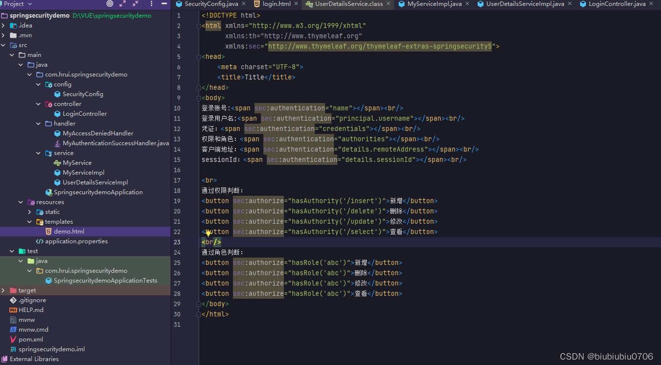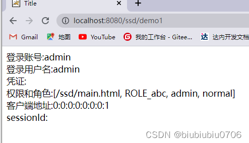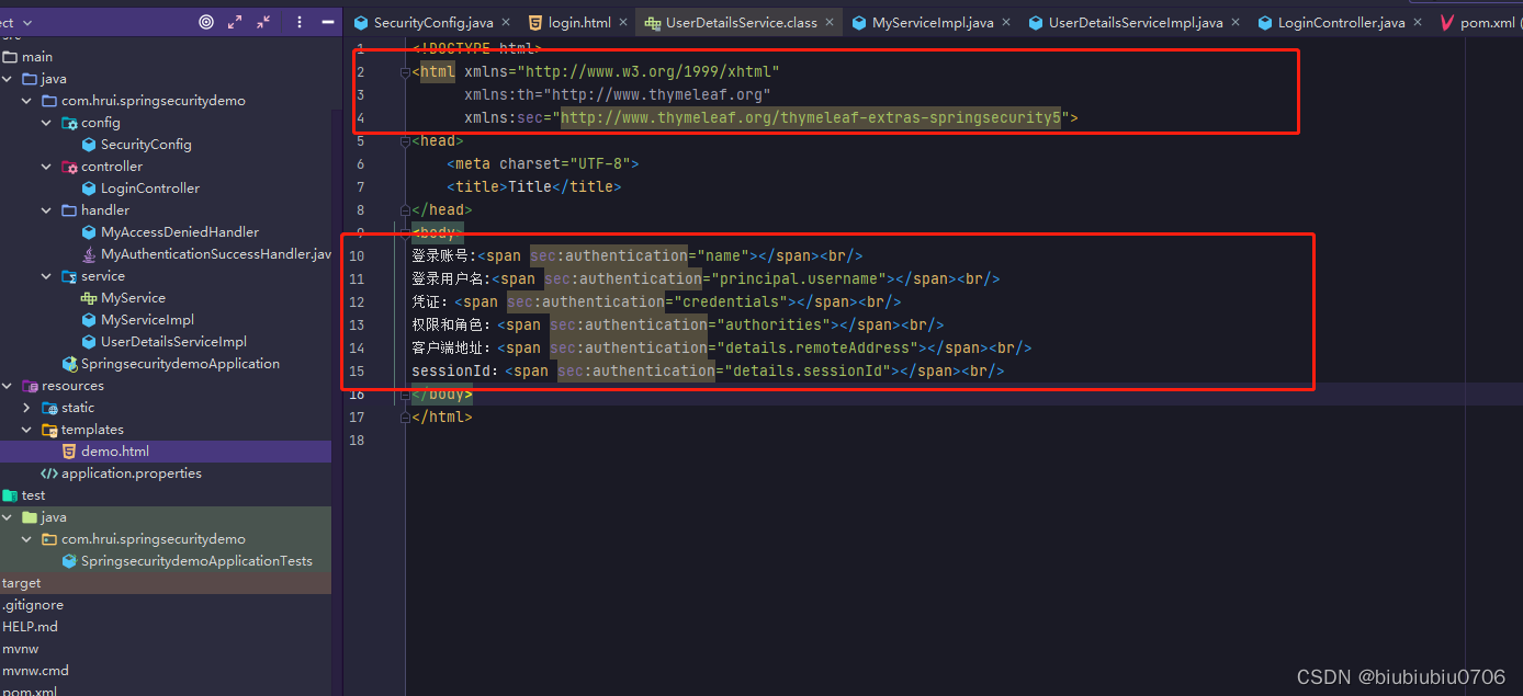 xmlns = "http://www.w3.org/1999/xhtml" xmlns:th = "http://www.thymeleaf.org"//Thmeleaf命名空间 xmlns:sec = "http://www.thymeleaf.org/thymeleaf-extras-//security命名空间 springsecurity5" > 可以在 html 页面中通过 sec:authentication="" 获取 UsernamePasswordAuthenticationToken 中所有 getXXX 的内容,包含父类中的 getXXX 的 内容。 根据源码得出下面属性: name :登录账号名称 principal :登录主体,在自定义登录逻辑中是 UserDetails credentials :凭证 authorities :权限和角色 details :实际上是 WebAuthenticationDetails 的实例。可以获取 remoteAddress ( 客 户端 ip) 和 sessionId ( 当前 sessionId) 演示下 templates新建个demo.html
