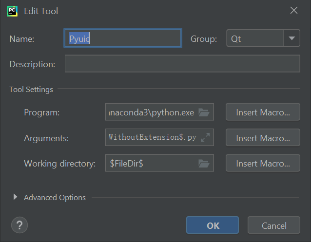 Arguments:-m PyQt5.uic.pyuic \$FileName\$ -o \$FileNameWithoutExtension\$.py