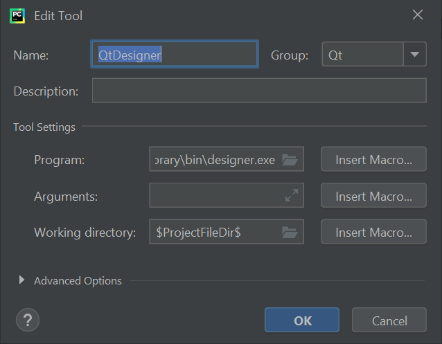 完成后点“OK”,现在QtDesigner就配置好了, 就可以直接在PyCharm中打开它来画界面了