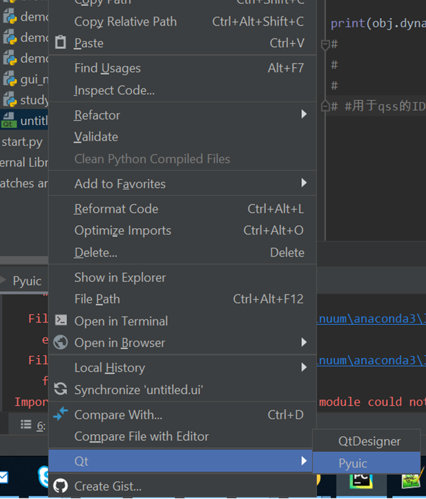 在Pycharm中,右键点击该文件,Qt --> Pyuic,执行后,对应的新的xxx.py文件会生成在xxx.ui文件同级目录下
