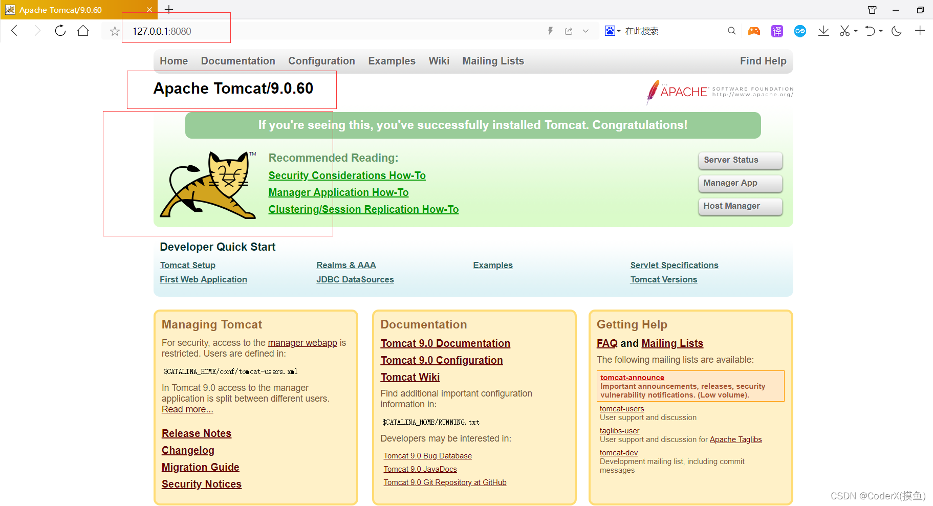 5. 打开浏览器在网址栏输入127.0.0.1:8080,看到汤姆猫就成功了(也能看到你的tomcat版本号)