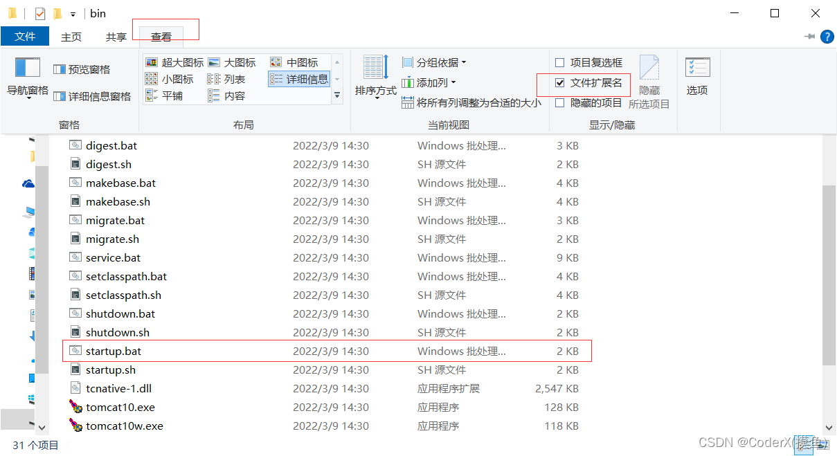 3. 打开bin目录,找到并打开startup.bat(没有后缀的看图勾选文件后缀名)
