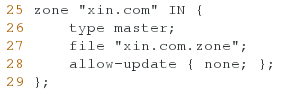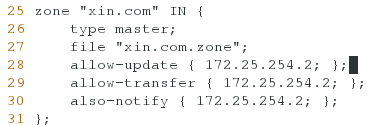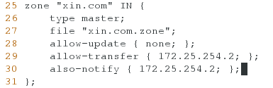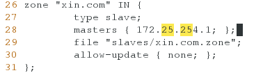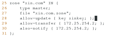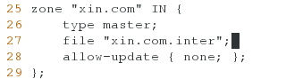 2、编辑文件/etc/named.rfc1912.zones,在xin.com域名的结构体设置允许更新主机的IP,并且重启服务。