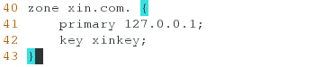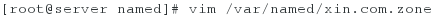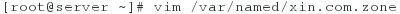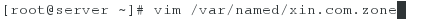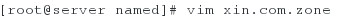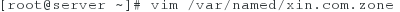 编辑/etc/named.rfc1912.zones文件,在xin.com域名设置