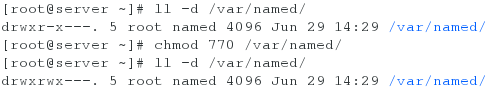 既然需要其他主机更改主服务器上的数据,所以就要设置/var/named/目录的权限。这个目录的所有组是named