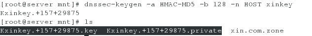 dnssec-keygen -a HMAC-MD5 -b 128 -n HOST xinkey (-a:指定加密方式---HMAC-MD5为对称加密;-b:指定密钥的长度;通过命令"dnssec-keygen --help"查看帮助,或者"man dnssec-keygen"查看帮助)