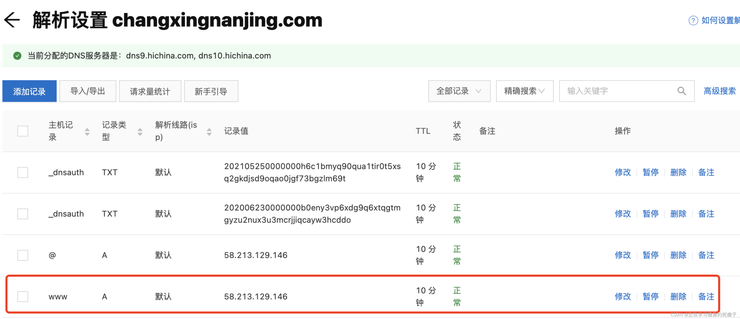 - A记录:地址记录,用来指定域名的IPv4地址(如:8.8.8.8),如果需要将域名指向一个IP地址,就需要添加A记录。