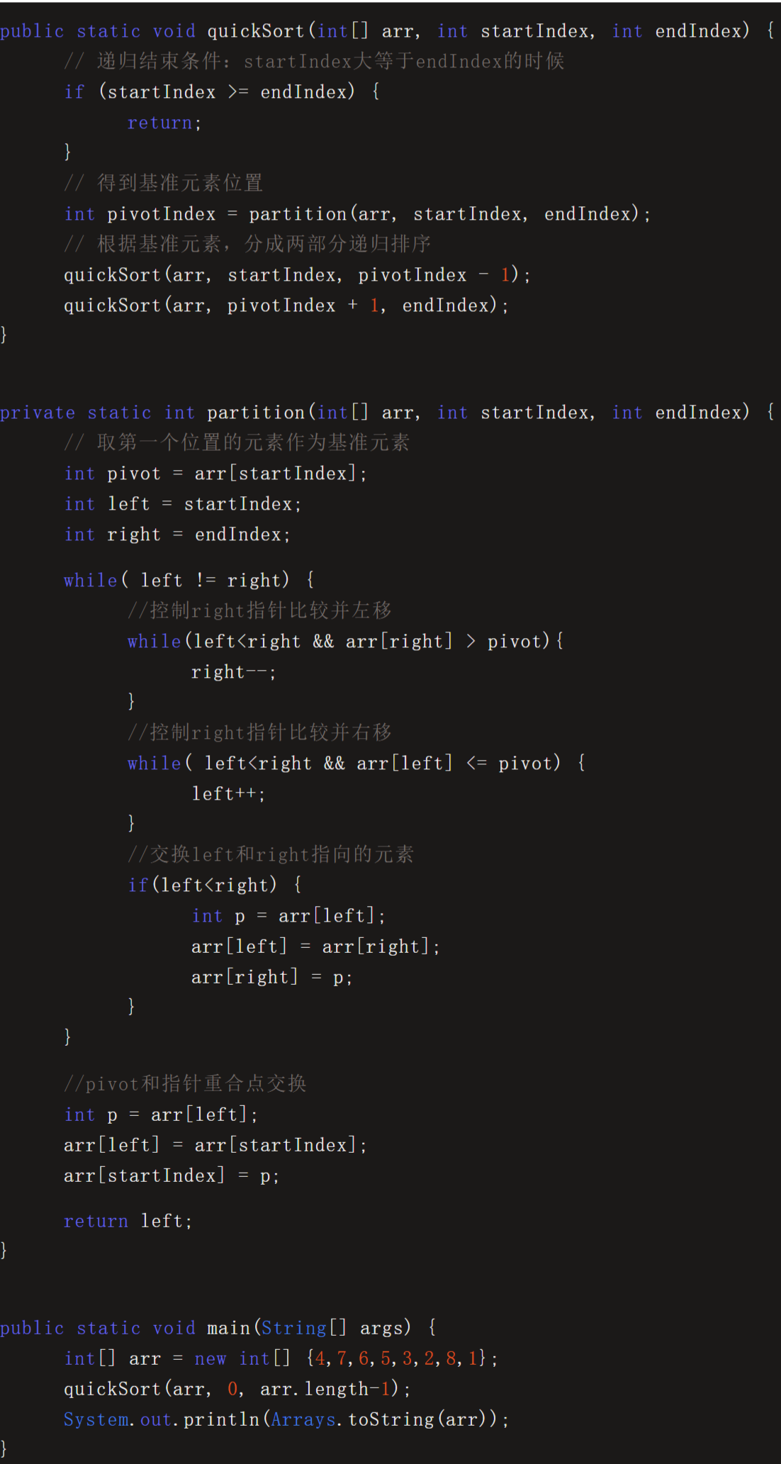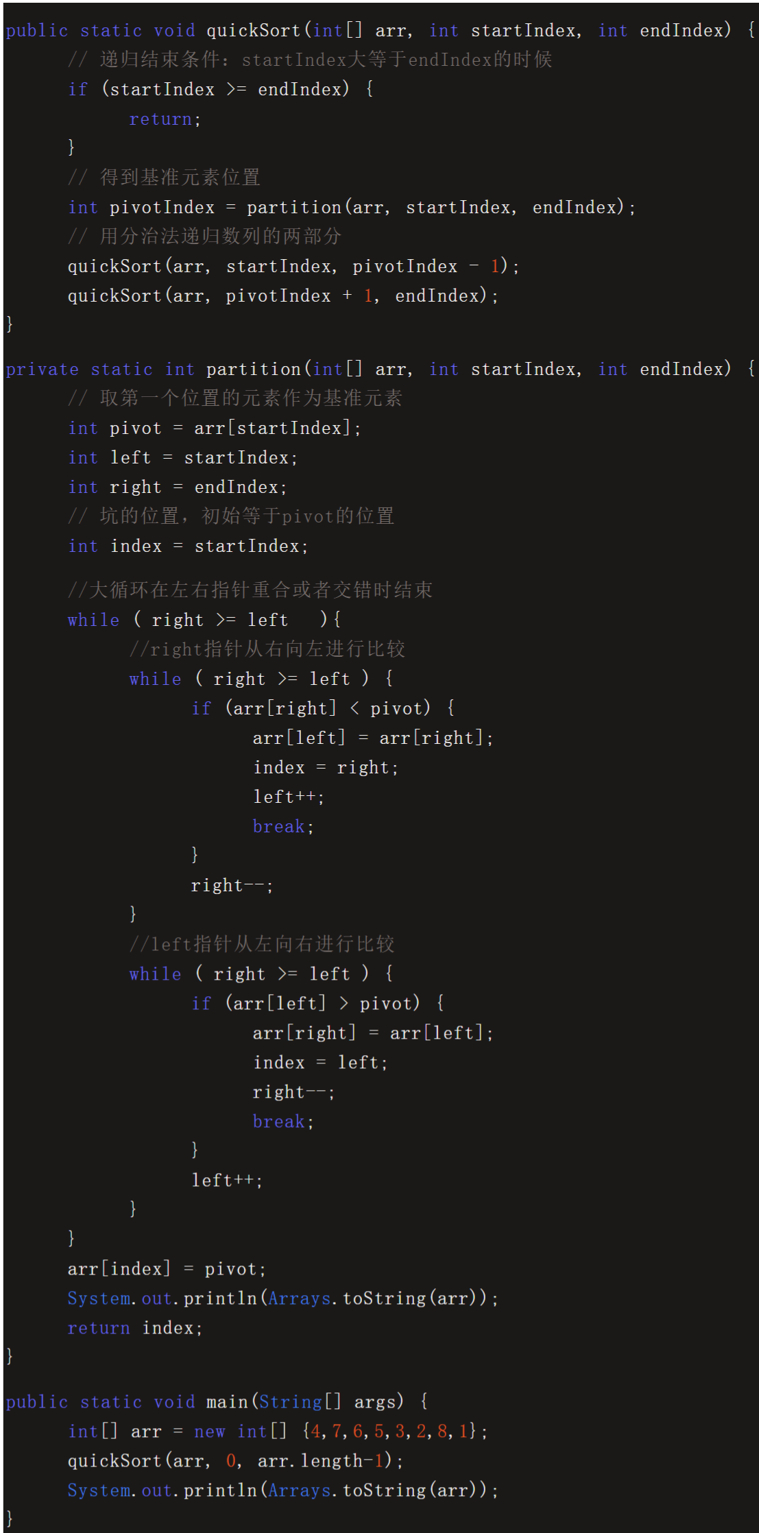 代码中,quickSort方法通过递归的方式,实现了分而治之的思想。