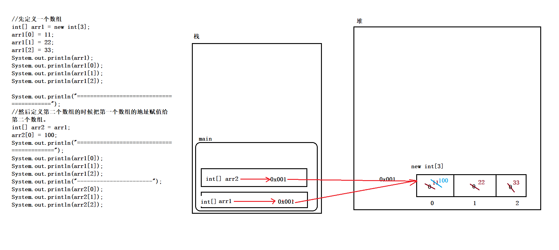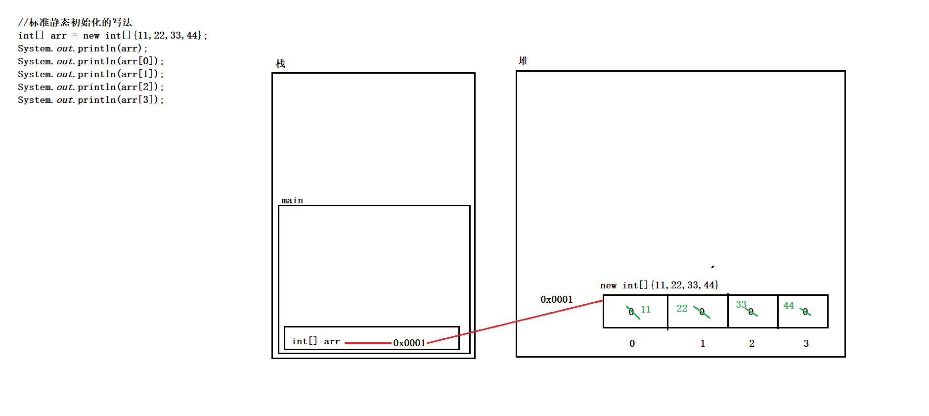 // int[] arr = new int[]{11,22,33,44};int[] arr;arr = new int[]{11,22,33,44};System.out.println(arr);System.out.println(arr[0]);System.out.println(arr[1]);System.out.println(arr[2]);System.out.println(arr[3]);System.out.println("=====================================");