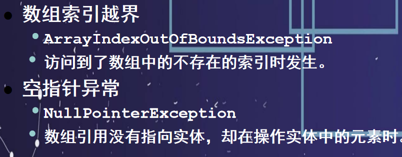 // System.out.println(arr[3]); //ArrayIndexOutOfBoundsException 数组索引越界异常arr = null;System.out.println(arr[0]); //NullPointerException 空指针异常}