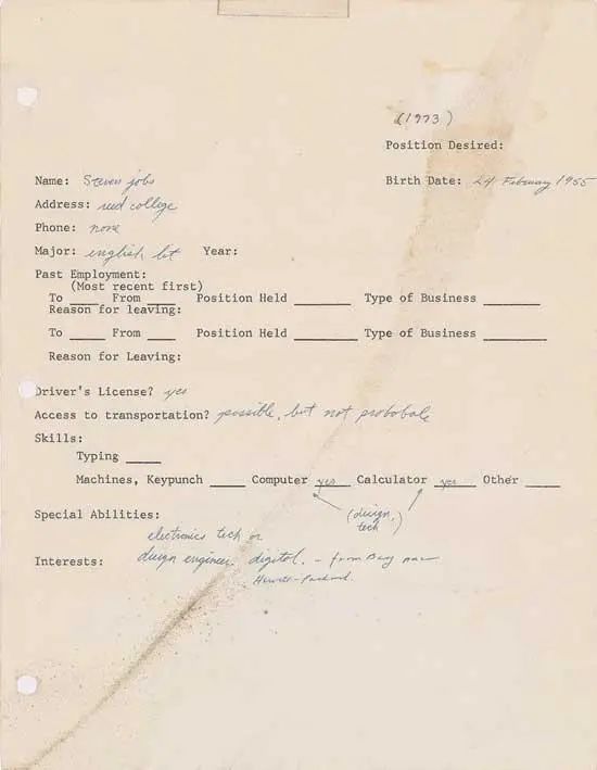 当时他辍学6个月并开始寻找工作,因此填写了这份求职书。