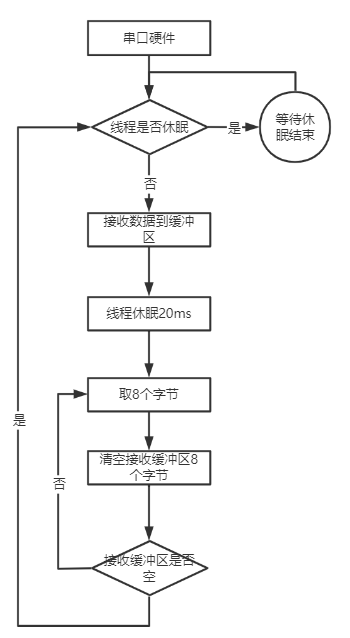 这里的关键是调用sleep(20),把调用线程从线程调度器的可运行队列中移除20ms,这样程序在这20ms中是不再接收串口数据的。