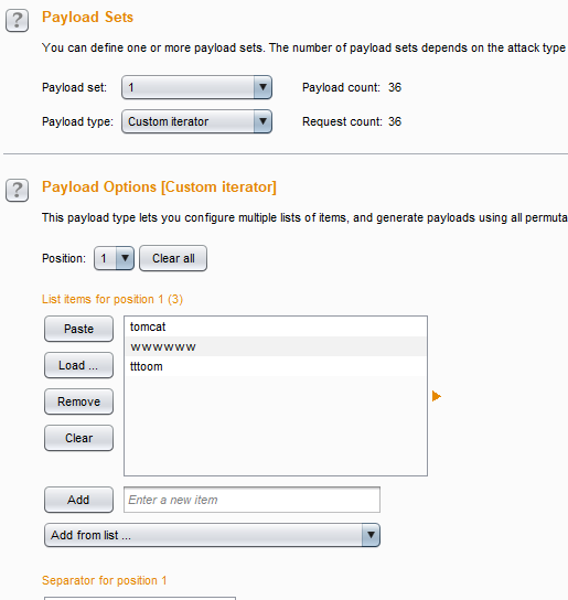 上面我们得到了tomcat数据传递格式为username:password的格式,这是就要使用到burp模糊测试模块中的customiterator自定义迭代类型的payload,官方的解释是该类型的payload共分为8个占 位符,每一个占位又可以指定简单列表的payload类型。再根据占位的数值,与每一个payload列表区进行笛卡儿积生成集合组。
