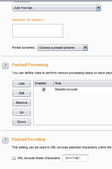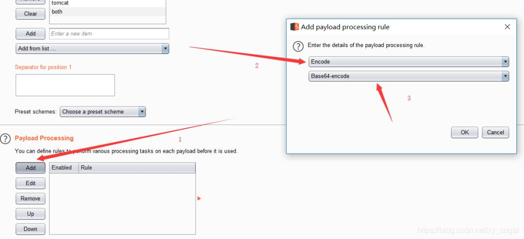 按照payload类型分组进行设置Position参数,比如说我们要爆破的Tomcat数据。需要设置的第一个Position参数就是 username参数,然后再进行添加payload字典。以此类推第二个参数就是冒号:,第三个就是password字段。设置完成后再需要对数据字段 进行base64编码就可以爆破了。设置方法如下图所示: