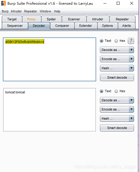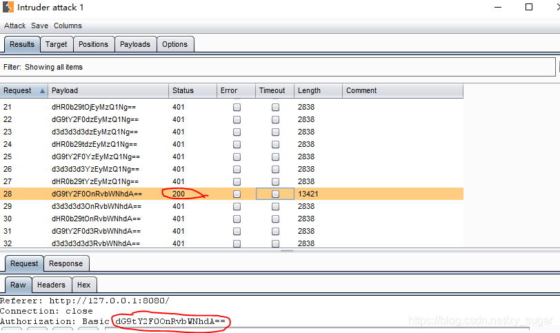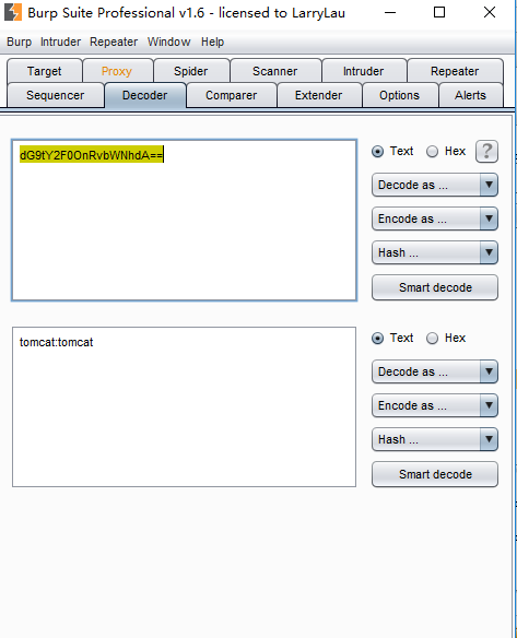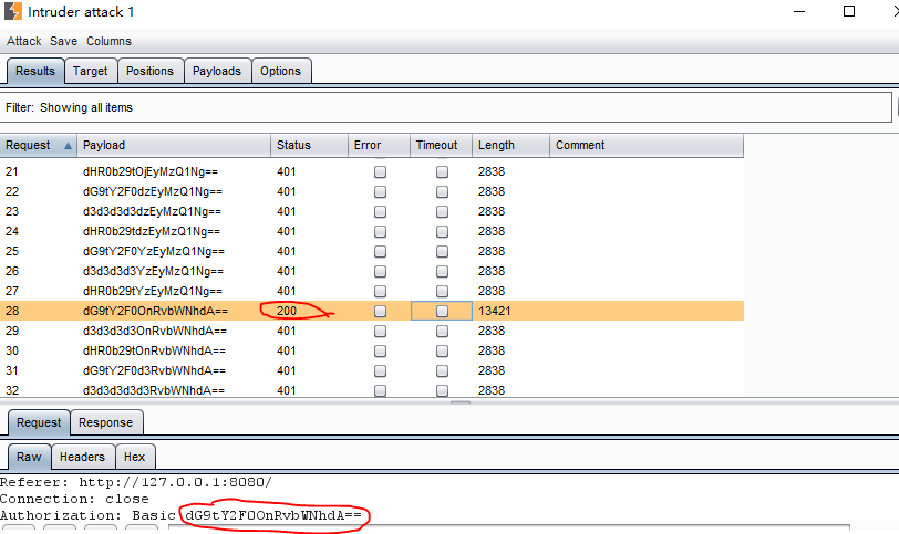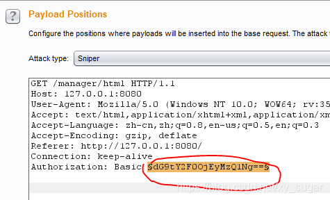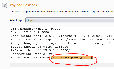 可以得出tomcat在授权认证时,将账号与密码用冒号进行组合再辅以base64加密所传递。(401认证)接下来我们构造字典来进行爆破。利用burp抓包发送到Intrude模糊测试模块来进行暴力破解。