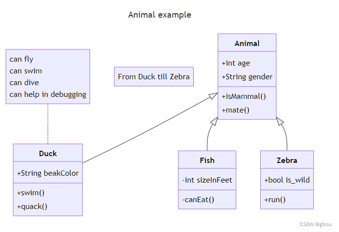 classDiagramnote "From Duck till Zebra"Animal <|-- Ducknote for Duck "can fly\ncan swim\ncan dive\ncan help in debugging"Animal <|-- FishAnimal <|-- ZebraAnimal : +int ageAnimal : +String genderAnimal: +isMammal()Animal: +mate()class Duck{+String beakColor+swim()+quack()}class Fish{-int sizeInFeet-canEat()}class Zebra{+bool is_wild+run()}