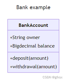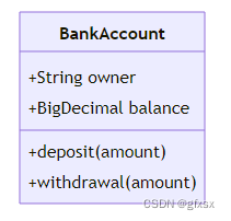 classDiagramclass BankAccountBankAccount : +String ownerBankAccount : +Bigdecimal balanceBankAccount : +deposit(amount)BankAccount : +withdrawal(amount)