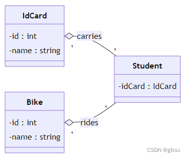 classDiagramdirection RLclass Student {-idCard : IdCard}class IdCard{-id : int-name : string}class Bike{-id : int-name : string}Student "1" --o "1" IdCard : carriesStudent "1" --o "1" Bike : rides