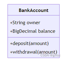 class BankAccount{+String owner+BigDecimal balance+deposit(amount)+withdrawal(amount)