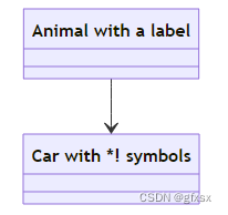 classDiagramclass Animal["Animal with a label"]class Car["Car with *! symbols"]Animal --> Car