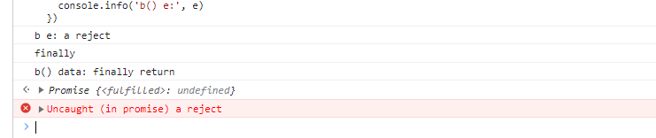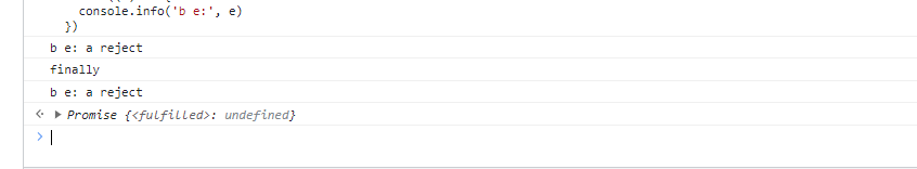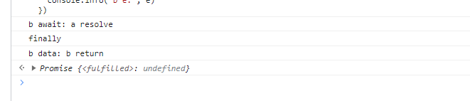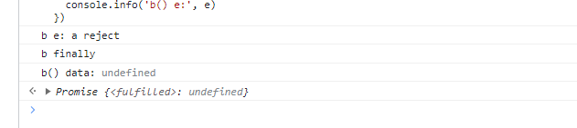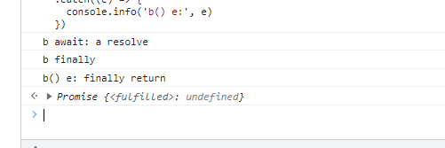 }var b = async () => {try {var res = await a()console.info('b await:', res)return 'b resolve'} catch (e) {console.info('b e:', e)} finally {console.info('b finally')}