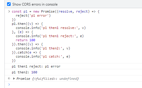 }, (e) => {console.info('p1 then1 reject:', e)return 100