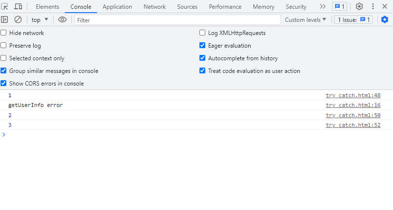 const mounted = async () => {console.log(1)try {const userInfo = await getUserInfo()} catch (err) {console.log('user catch', err)}console.log(2)try {const list = await getList()} catch (err) {console.log('list', err)}console.log(3)