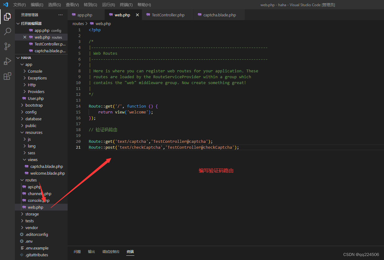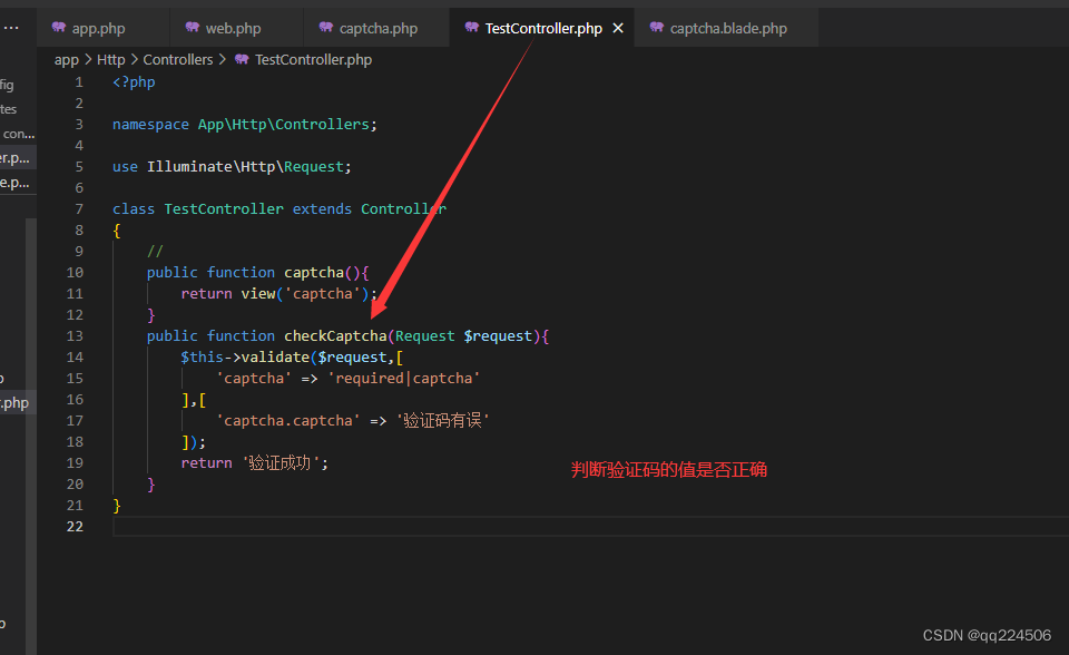 在上述图片代码中第15行代码的captcha验证规则是安装了验证码库以后才有的规则,它可以自动判断用户提交的验证码是否正确;第6行代码用于配置验证码时有误的提示文本。