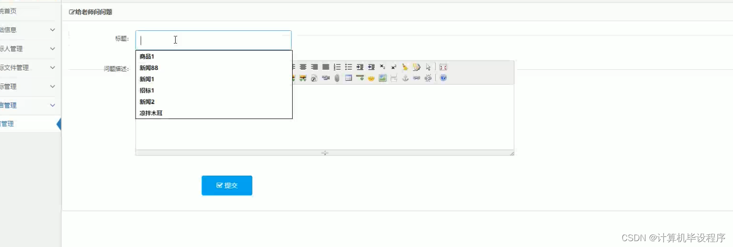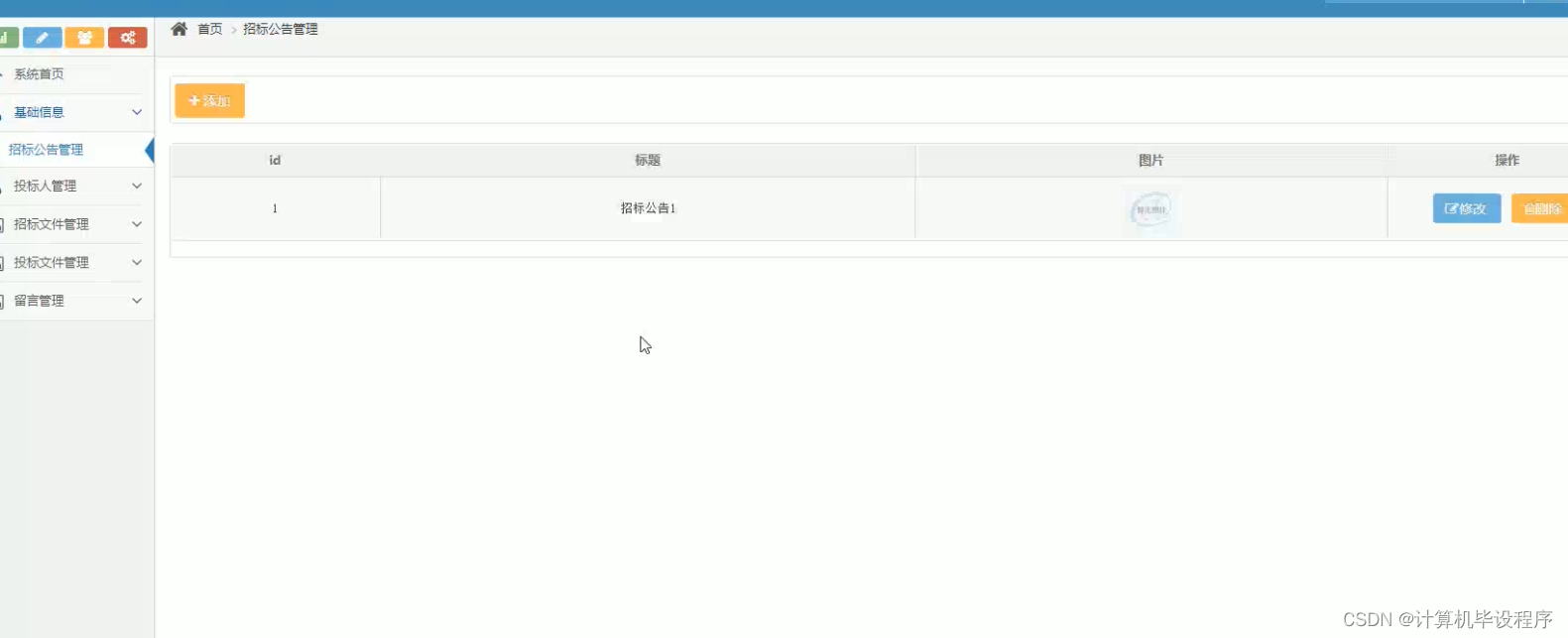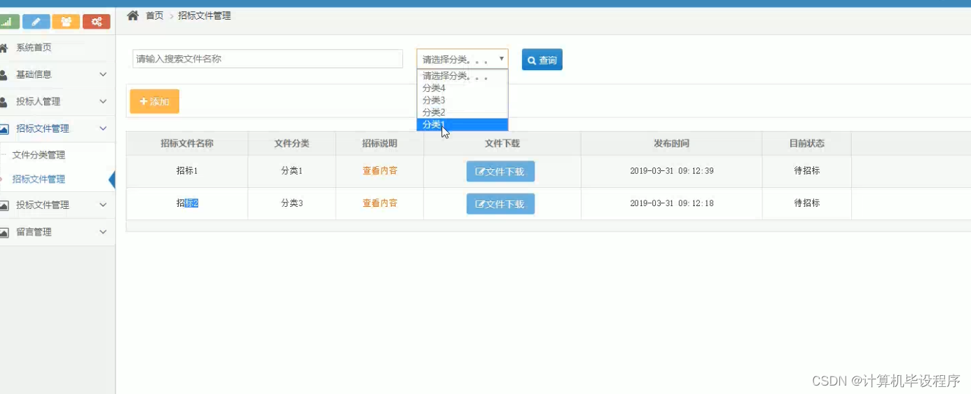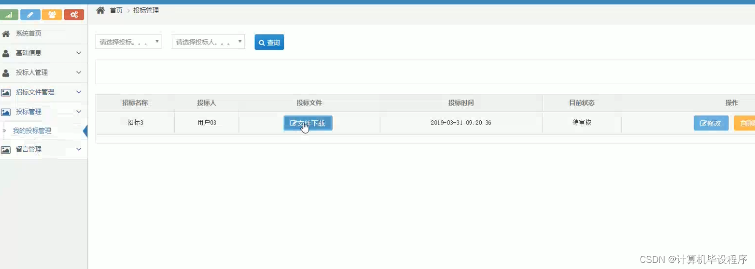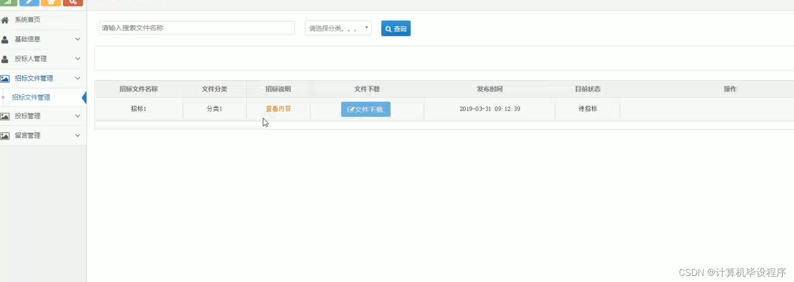 招标文件展示功能可以展示招标文件的信息在前端界面中,将招标文件的相关资讯显示在前端接口上,用户可以在前端的界面上进行浏览,而在前端界面上,则由规则运算来分析招标文件的相关资讯。在使用管理键的同时,还需向后台的逻辑码代码发送招标文件编号,并通过 SQL语句来实现对招标文件的数据进行实时的更新。