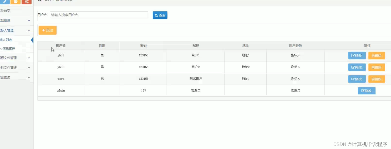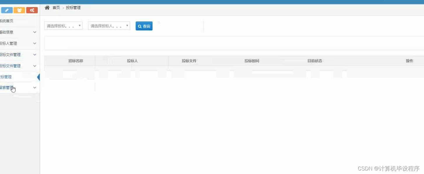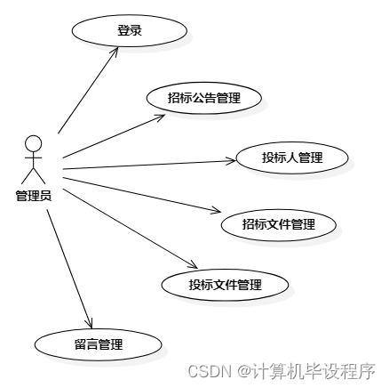 管理员:登录、招标公告管理、投标人管理、招标文件管理、投标文件管理、留言管理。