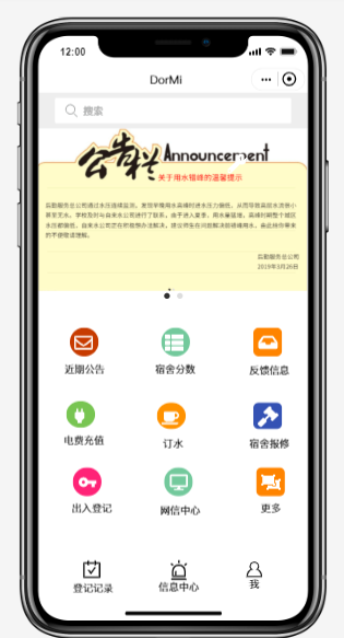 本平台将集成充电费、订水、宿舍报修等功能。 - 信息通知功能