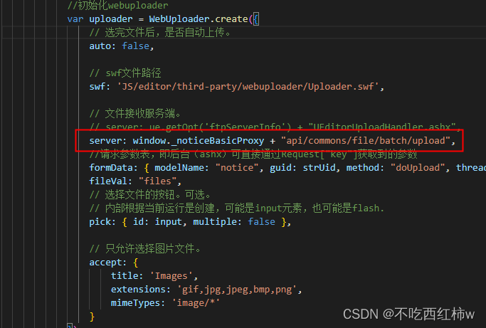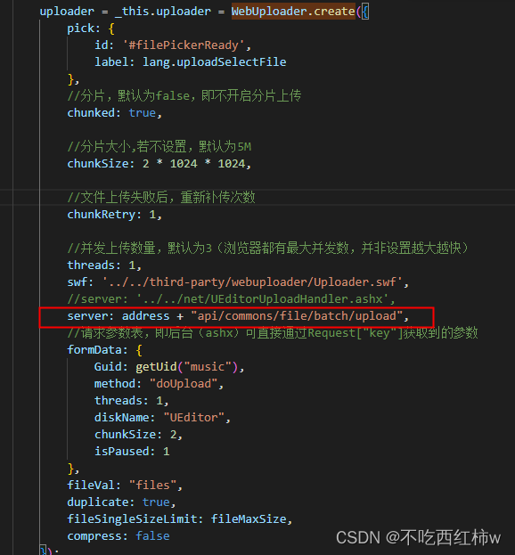 server就是你文件上传的接口路径,然后可以在formData里设置额外参数,因为上传文件时,formData中默认file【文件对象】的key是”file“,如果需要修改,则设置fileVal: "xxx",其他具体参数的了解与使用可以去官网查看:WebUploader API文档 - Web Uploader http://fex.baidu.com/webuploader/doc/index.html