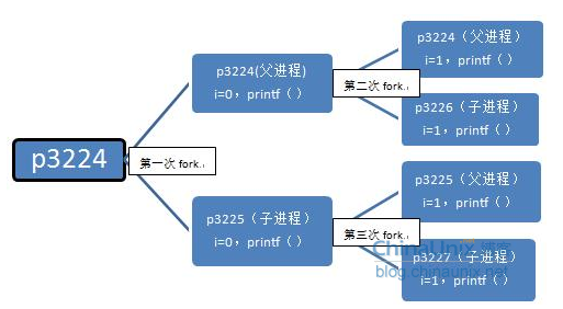 第一次fork后,p3224(父进程)的变量为i=0,pid=3225(fork函数在父进程中返向子进程id),代码内容为: