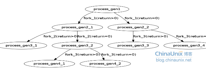 对于子进程p3225,执行完第一次循环后,i=1,接着执行fork,系统中新增一个进程p3227,对于此进程,p3224->p3225(当前进程)->p3227(被创建的子进程)。从输出可以看到p3225原来是p3224的子进程,现在变成p3227的父进程。父子是相对的,这个大家应该容易理解。只要当前进程执行了fork,该进程就变成了父进程了,就打印出了parent。