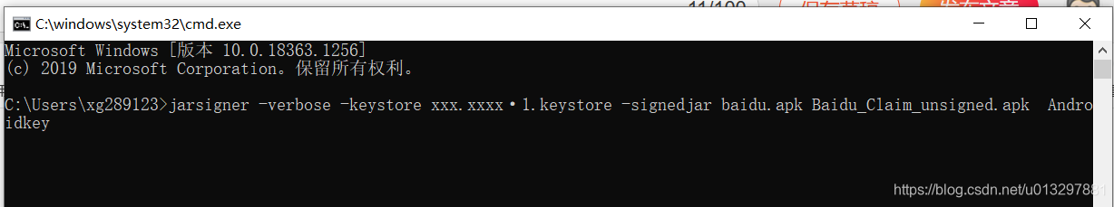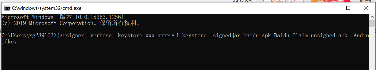 jarsigner -verbose -keystore xxx.xxxx·1.keystore -signedjar baidu.apk Baidu_Claim_unsigned.apk Androidkey