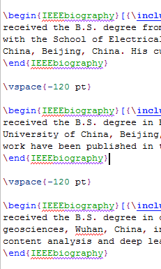 3、\vspace{-10 mm} 这个是加在 \end{IEEEbiography} 和 \begin{IEEEbiography} 中间的,因为我的作者简介都比较短,所以设置的数值就比较大,这个根据自身情况进行调整。