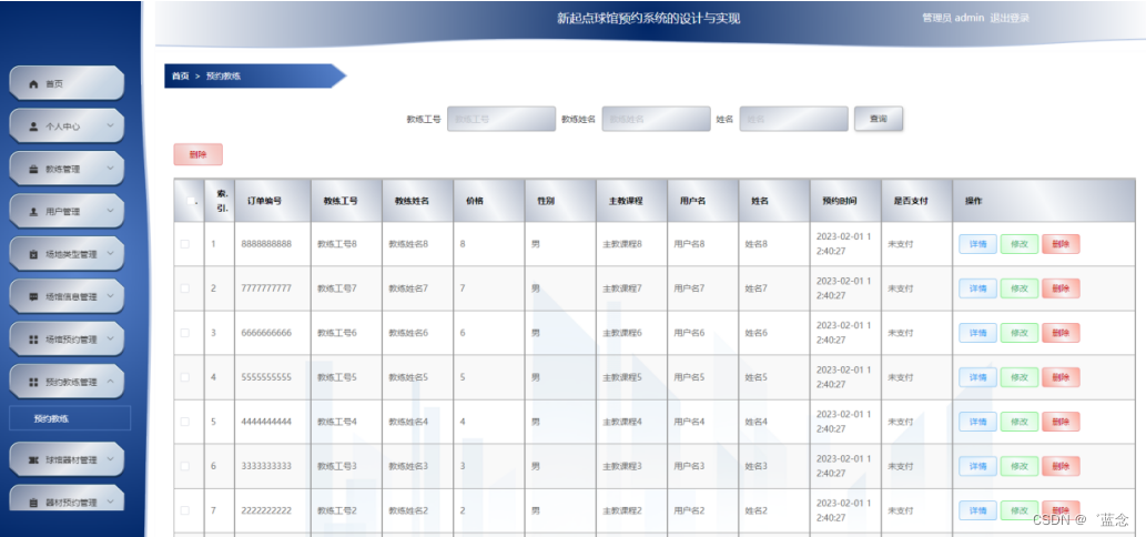 管理员点击预约教练管理。在预约教练页面输入教练工号,教练姓名和姓名进行查询或删除预约教练列表,并根据需要对预约教练详细信息进行详情、修改或删除操作。如图5-12所示: