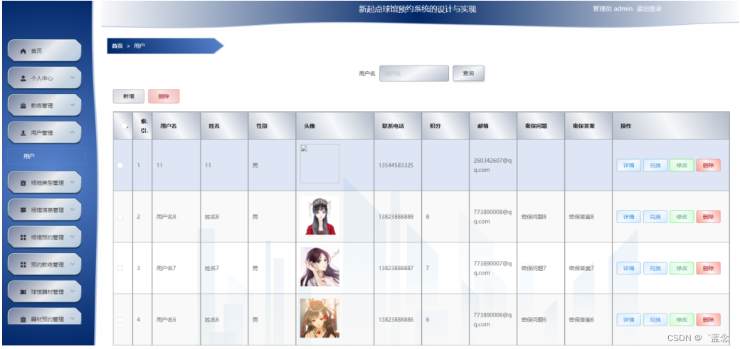 管理员点击用户管理。在用户页面输入用户名进行查询、新增或删除用户列表,并根据需要对用户详情信息进行详情、兑换、修改或删除操作;如图5-8所示: