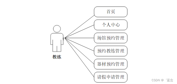 教练使用本系统涉到的功能主要有首页,个人中心,场馆预约管理,预约教练管理,器材预约管理,请假申请管理等功能。教练用例如图3-3所示。