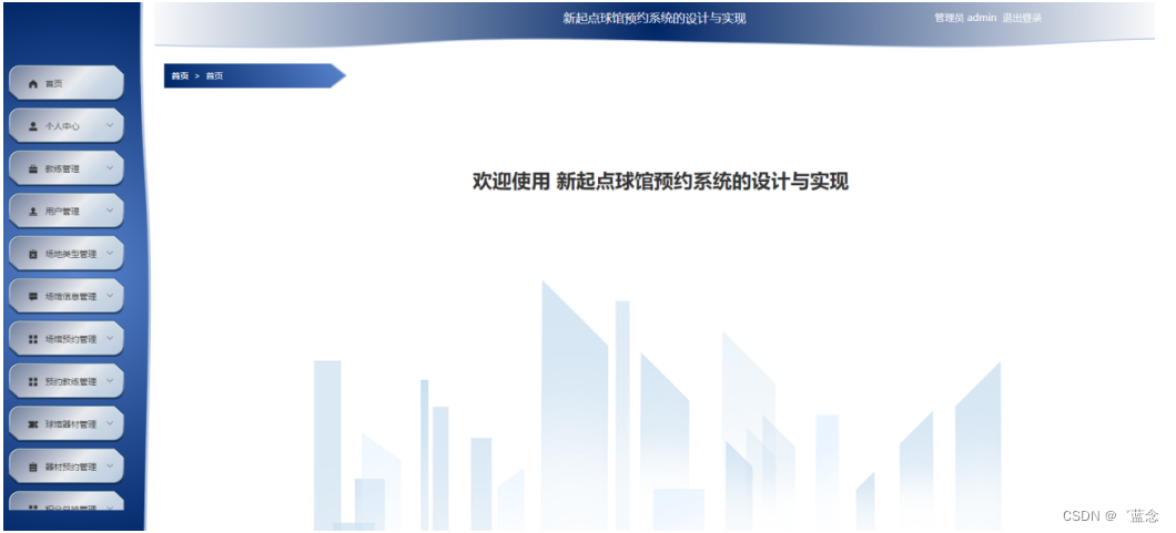 管理员进入主页面,主要功能包括对个人中心、专业管理、班级管理、用户管理、教练管理、宿舍信息管理、新起点球馆预约、预约教练管理、器材预约管理、积分兑换管理、请假申请、系统管理等进行操作。管理员主页面如图5-7所示: