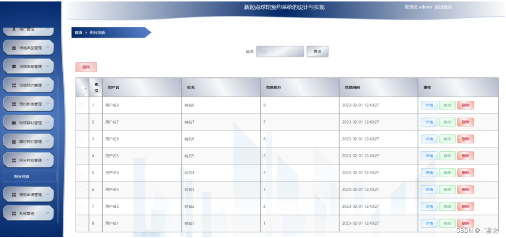 管理员点击积分兑换管理。在积分兑换页面输入姓名进行查询或删除积分兑换列表,并根据需要对积分兑换详细信息进行详情、修改或删除操作。如图5-14所示: