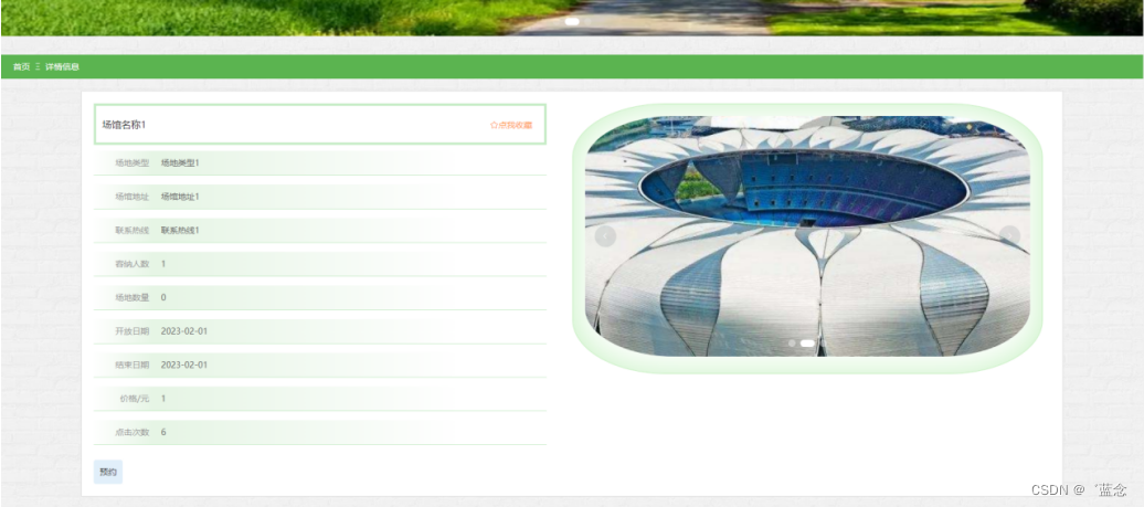 场馆信息:在场馆信息页面的输入栏中输入场馆名称和选择场地类型进行查询,可以查看到场馆信息详细信息,并根据需要进行收藏或预约操作;场馆信息页面如图5-4所示: