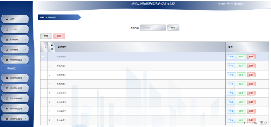 管理员点击场地类型管理。在场地类型页面选择场地类型进行查询、新增或删除场地类型列表,并根据需要对场地类型详细信息进行详情、修改或删除操作。如图5-10所示: