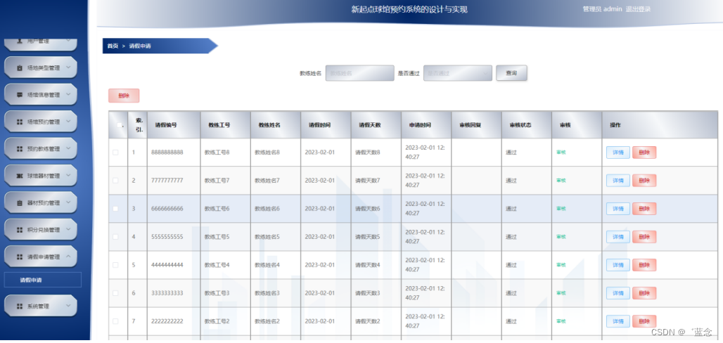 管理员点击请假申请管理。在请假申请页面输入教练姓名和选择是否通过进行查询或删除请假申请列表,并根据需要对请假申请详细信息进行详情或删除操作;如图5-15所示:
