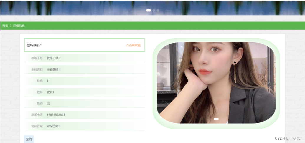 教练:在教练页面的输入栏中输入教练工号,教练姓名和主教课程进行查询,可以查看到教练详细信息,并根据需要进行收藏或预约操作;教练页面如图5-3所示: