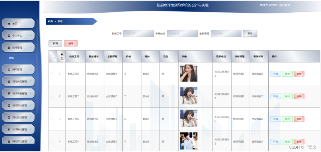 管理员点击教练管理。进入教练页面输入教练工号,教练姓名和主教课程进行查询、新增或删除教练列表,并根据需要对教练信息进行详情、修改或删除操作。如图5-9所示: