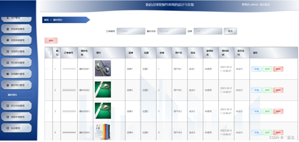 管理员点击器材预约管理。在器材预约页面输入订单编号,器材名称和品牌进行查询或删除器材预约列表,并根据需要对器材预约详细信息进行详情、修改或删除操作。如图5-13所示: