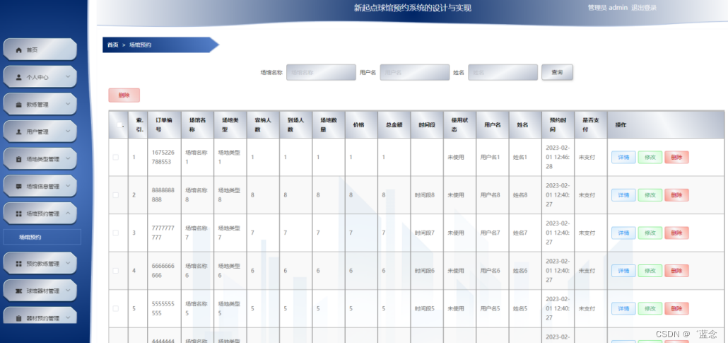 管理员点击场馆预约管理。在场馆预约管理页面输入场馆名称,用户名和姓名进行查询、删除场馆预约列表,并根据需要对场馆预约详细信息进行详情、修改或删除操作。如图5-11所示: